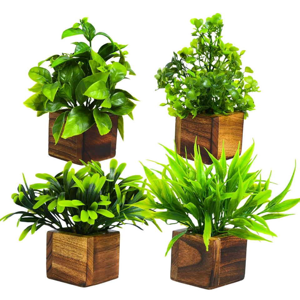 Breathe life into your home or office with this charming set of 4 artificial potted plants! Each plant features realistic leaves nestled in a stylish wooden pot, adding a touch of greenery without the upkeep.
