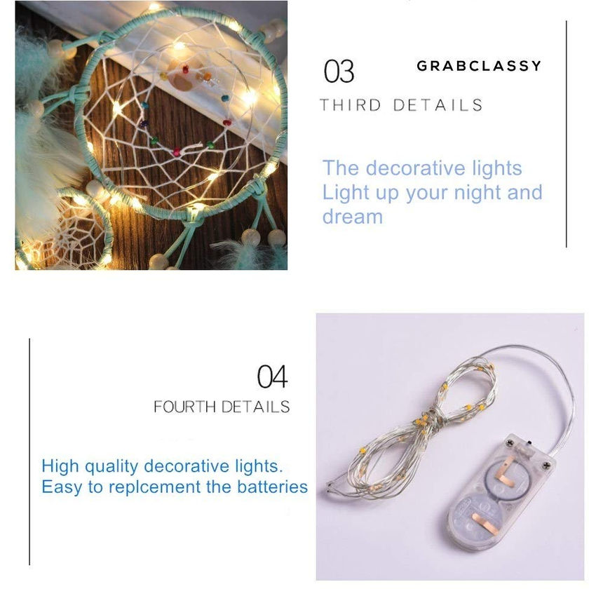 Made with high-quality materials including hemp threads, wooden beads, and feathers, this dream catcher is both beautiful and eco-friendly. The energy-efficient LED lights are powered by two included CR2032 batteries, lasting up to 72 hours continuously.