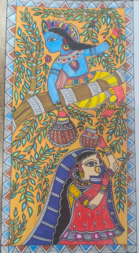 Carefully created in traditional Madhubani style, featuring intricate patterns, expressive figures, and vibrant natural elements that tell a story.